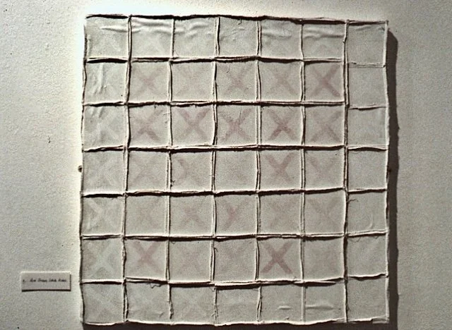 The use of the cross stitch as a means of putting things together is both celebrator of the (X marks the spot) and confrontational (crossing out, the exclusion of domains of material practice from high art significations). At the same time these works, in particular the quilts, ‘White Work’ and ‘By the Yard’ draw on a cultural armature which has something in common with the work of Robert Ryman, Agnes Martin and Sol Le Witt. That is to say, the means of production of their surfaces, simple juxtaposition and repetitive addition, leads to variations in quality, divergences from the norm. One can think of this as the margin of error. However, there seems to be a big gap between that as a rationalisation and the experience of ineffability that is the product of looking at the things. In ‘Purity and Danger’, Mary Douglas identifies dirt as ‘matter out of place’ and therefore, since it is free of categorial constraint, potentially highly volatile as a source of meaning. The signification that error has in the context of the kind of making that Anne is using, seems somewhat similar. Enlarging the frame slightly one might also say that Anne’s procedures for making are an error in the domain of fine art practice. This is a source of strength.